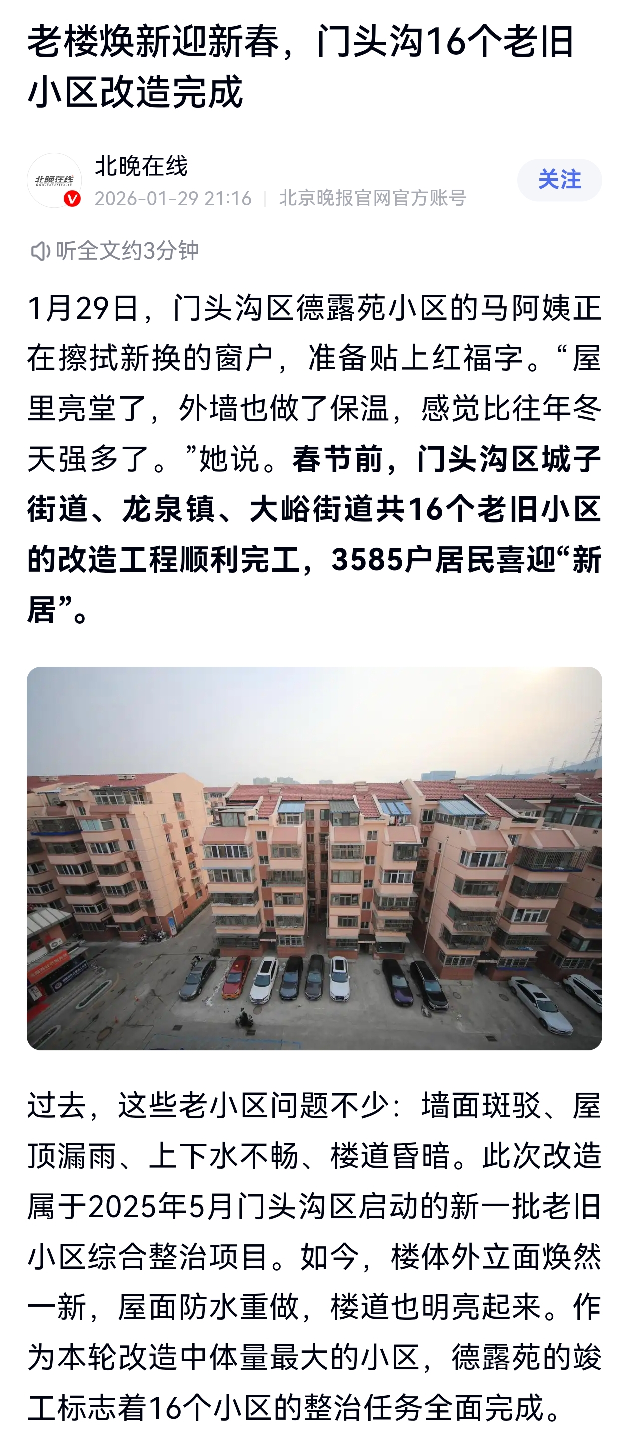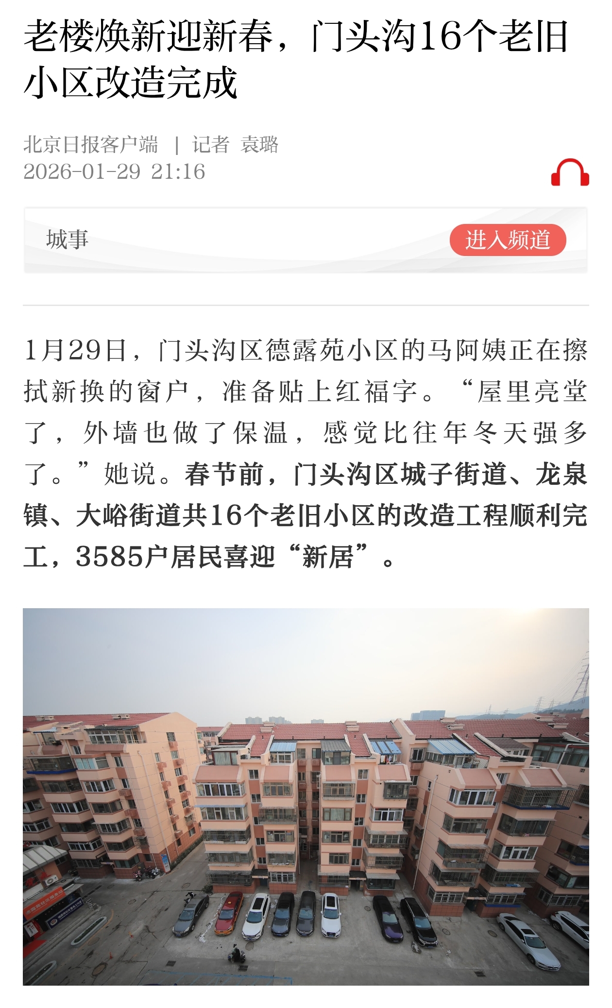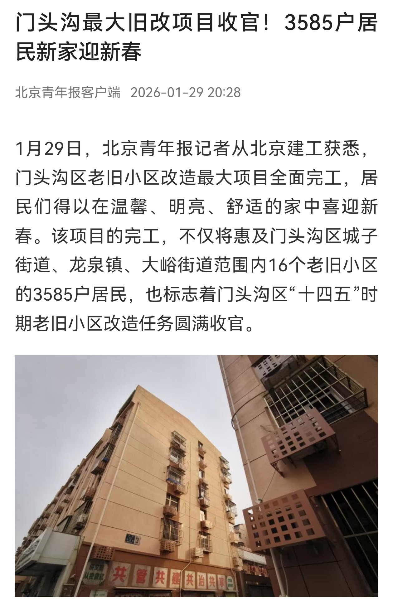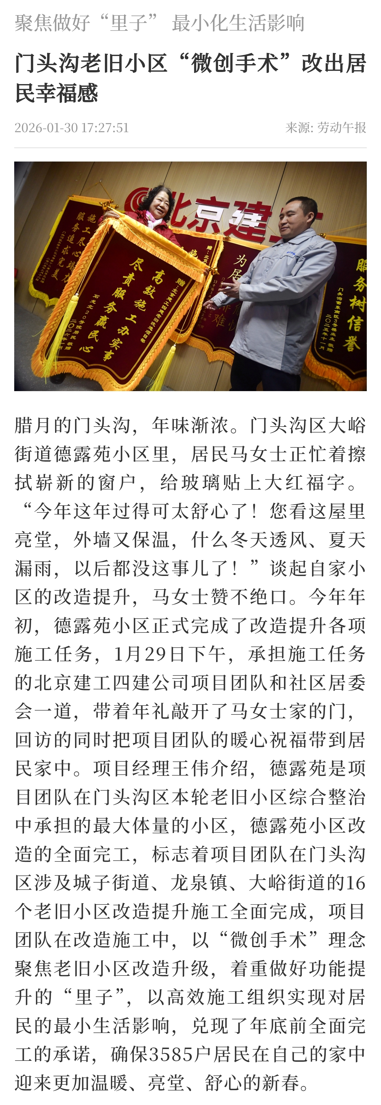 如今,穿行在改造后的小区,昔日斑驳的外墙披上了整洁美观的“新衣”,破旧的屋面解决了漏雨之忧,楼道亮堂了,上下水通畅了,室外环境也更加优美宜居。门头沟区老旧小区改造项目的圆满收官,是北京建工四建公司践行国企社会责任、用心用情服务保障民生的生动实践,项目团队以匠人之心破解难题,以家人之情温暖沟通,不仅改出了老旧小区的“新面貌”,更改出了居民群众的“幸福味”,为门头沟区城市更新画卷增添了浓墨重彩的一笔,也让三千余户居民在新居里迎来了一个更加温馨、祥和、充满希望的新春佳节。