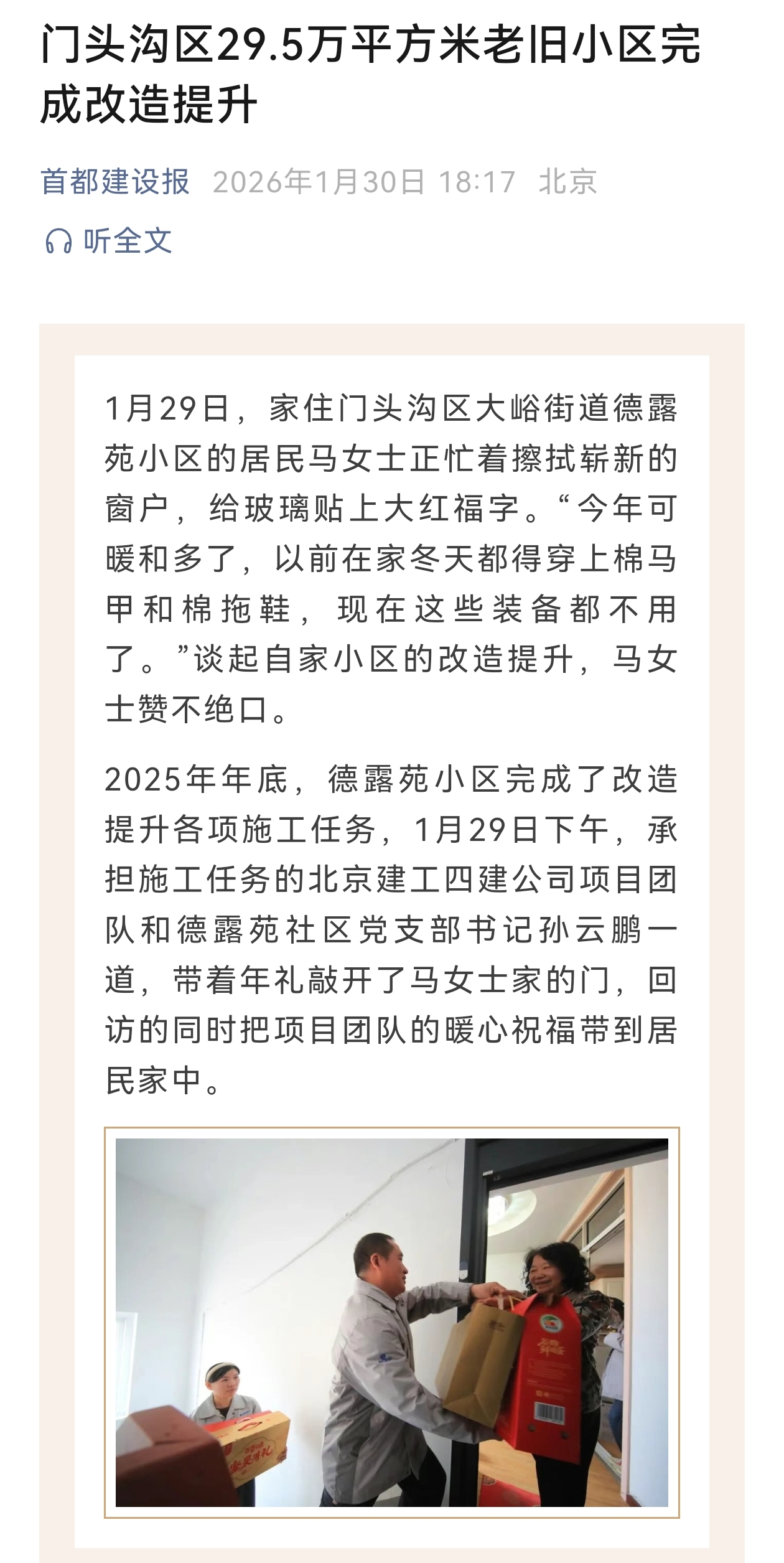 2026-02-02进入腊月,“年”的脚步是越来越近,年味儿也变得越来越浓。门头沟区大峪街道德露苑小区里,居民马阿姨正忙着擦拭崭新的窗户,给玻璃贴上大红福字。“今年这年过得可太舒心了!屋里亮堂,外墙又保温,什么冬天透风、夏天漏雨,以后都没这事儿了!”1月29日下午,承担德露苑小区改造提升施工任务的北京建工四建公司项目团队和社区居委会一起带着年礼,敲开了马阿姨家的门,回访的同时把暖心祝福带到居民家中。