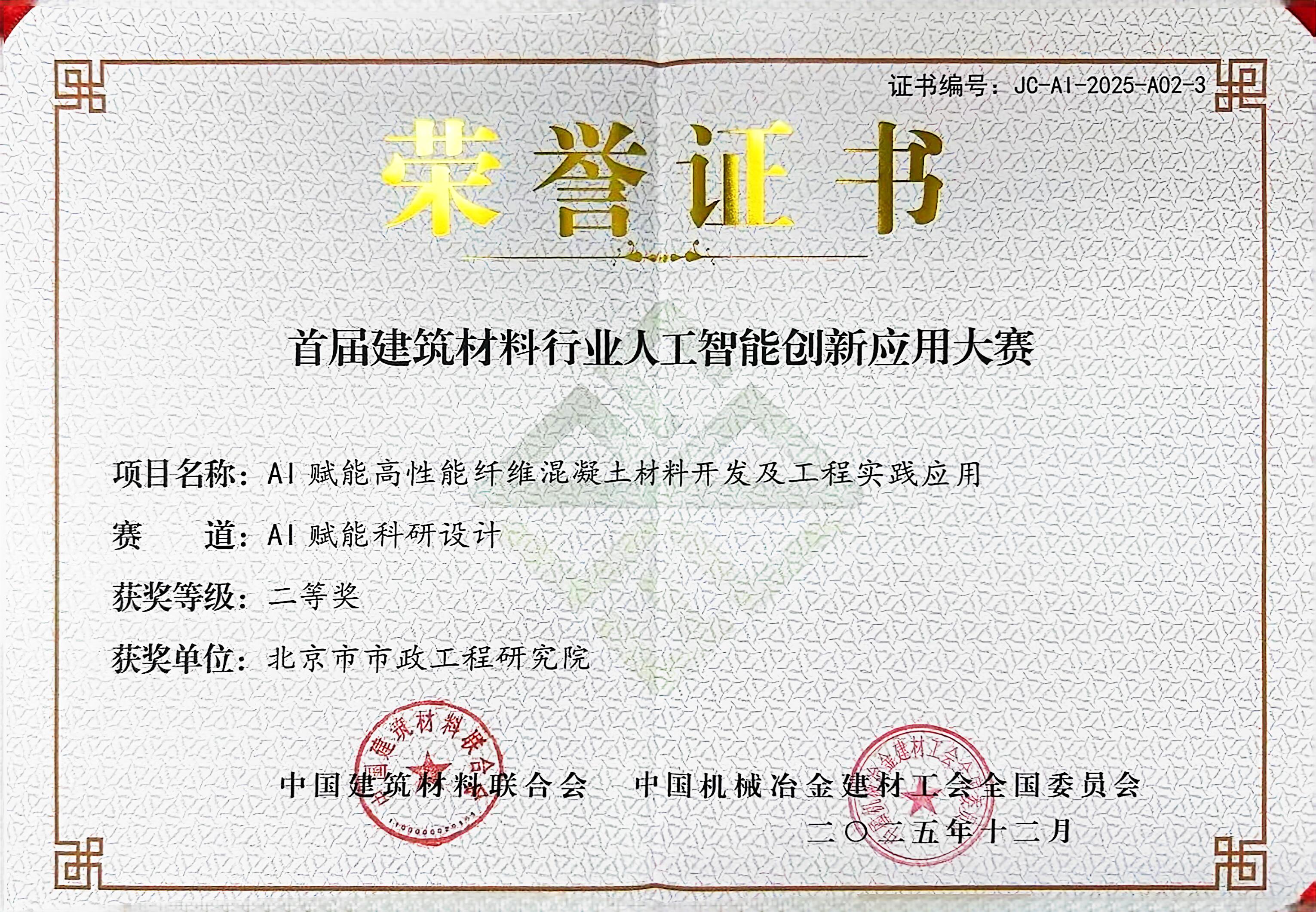 从2025年建筑材料行业大会上传来好消息,北京建工市政路桥科技发展公司市政工程研究院申报项目《AI赋能高性能纤维混凝土材料开发及工程实践应用》,获得首届建筑材料行业人工智能创新应用大赛二等奖。