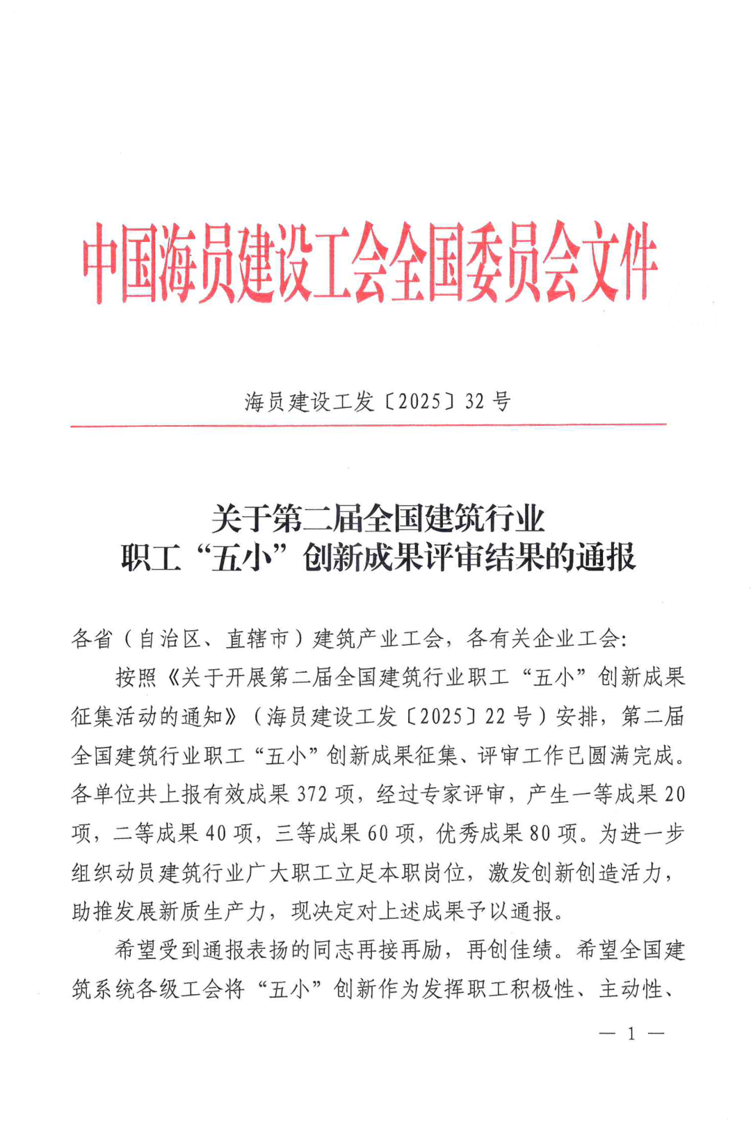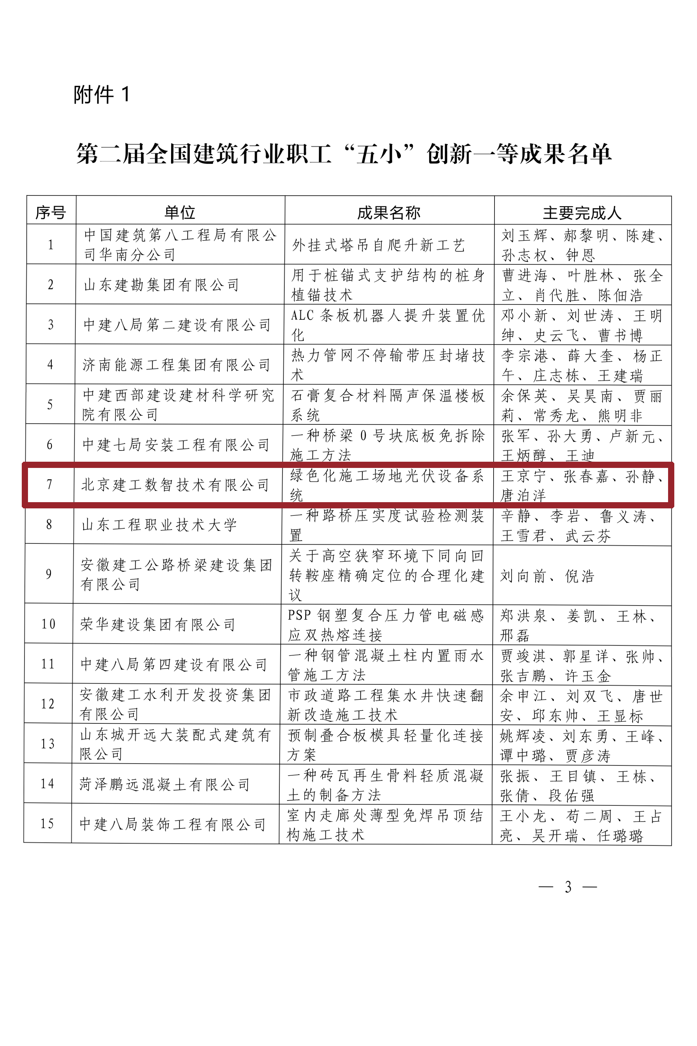 近日,第二届全国建筑行业职工“五小”创新成果评选结果公布,北京建工数智公司申报的《绿色化施工场地光伏设备系统》从全国372项申报成果中脱颖而出,获得“一等成果”。