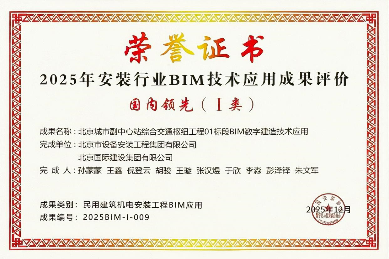 中国安装协会BIM技术应用成果交流会于近日在济南召开。集团申报的“北京城市副中心站综合交通枢纽工程01标段BIM数字建造技术应用”获评2025年安装行业BIM技术应用成果评价国内领先(I类)。