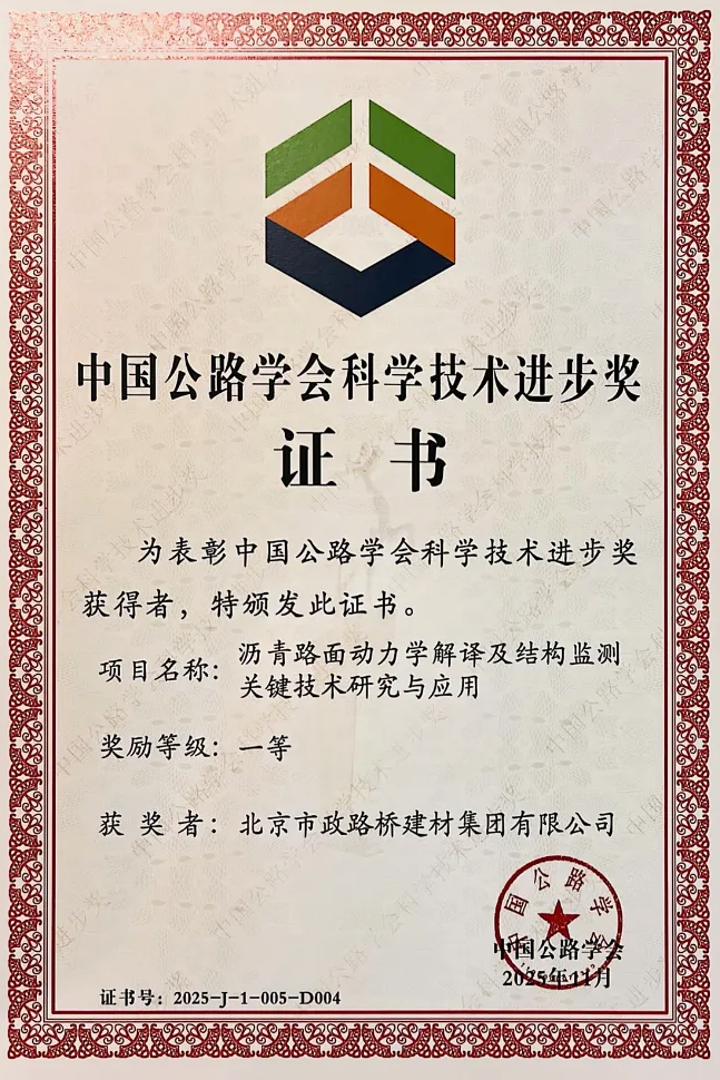 由北京建工市政路桥建材集团联合哈尔滨工业大学、内蒙古自治区交通运输科学发展研究院等国内多所知名院校及交通行业龙头企事业单位共同研发的《沥青路面动力学解译及结构监测关键技术研究与应用》项目,获评2025年度中国公路学会科学技术进步奖一等奖。