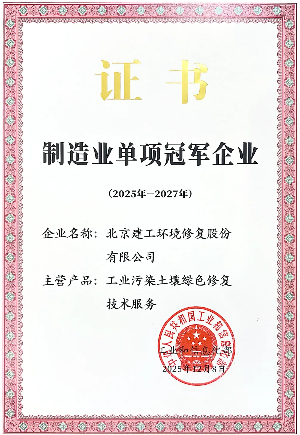 2026-04-16近日,工业和信息化部发布了“第九批制造业单项冠军企业”名单,北京建工修复公司凭借在工业污染土壤绿色修复领域的领先技术实力及突出的市场表现,获评“制造业单项冠军企业”,是本批次获评的24家北京市企业之一,也是该领域唯一一家获评企业。