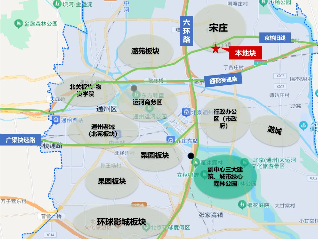 本地块为R2二类居住用地,位于通州区宋庄板块南部,占地面积约4.85公顷,地上建筑面积约8.64万平方米,容积率1.8,距宋庄艺术区核心区约2公里,南侧4公里为城市副中心行政办公区,东南方向4.5公里达运河商务区,西侧与南侧临近东六环和通燕高速,区位交通与发展势能兼备。