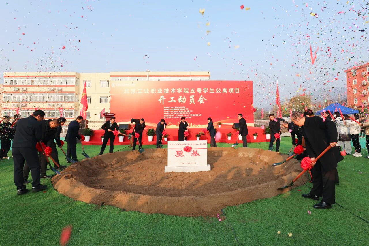 2025-11-1311月12日,北京工业职业技术学院五号学生公寓项目举行开工动员会。北京市教育委员会二级巡视员张凤华,门头沟区人民政府副区长马超鹰,北京市教育委员会基建处副处长刘洪涛,北京工业职业技术学院党委书记田红芳,党委副书记、校长柳长安,北京建工集团党委副书记、工会主席张军等领导出席活动。与会领导共同为项目培土奠基,标志着五号学生公寓项目正式由蓝图步入全面建设阶段。