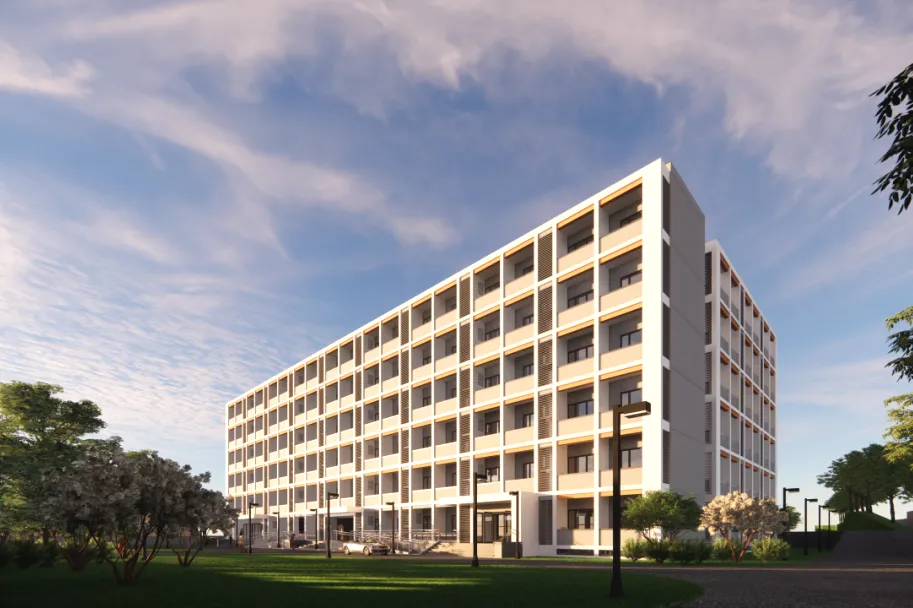 北京工业职业技术学院五号学生公寓项目是北京市重点工程,总建筑面积1.33万平方米,建筑高度23.7米,地上六层、地下二层。项目建成后预计增加学生宿舍219间(含无障碍宿舍3间),可解决1300余名学生的住宿需求。项目配套有公共浴室、生活超市、辅导员办公室、学生活动室等功能用房。该项目的实施将极大改善校区学生住宿环境、有效扩容办学承载力,为学校高质量发展注入新的强劲动能。