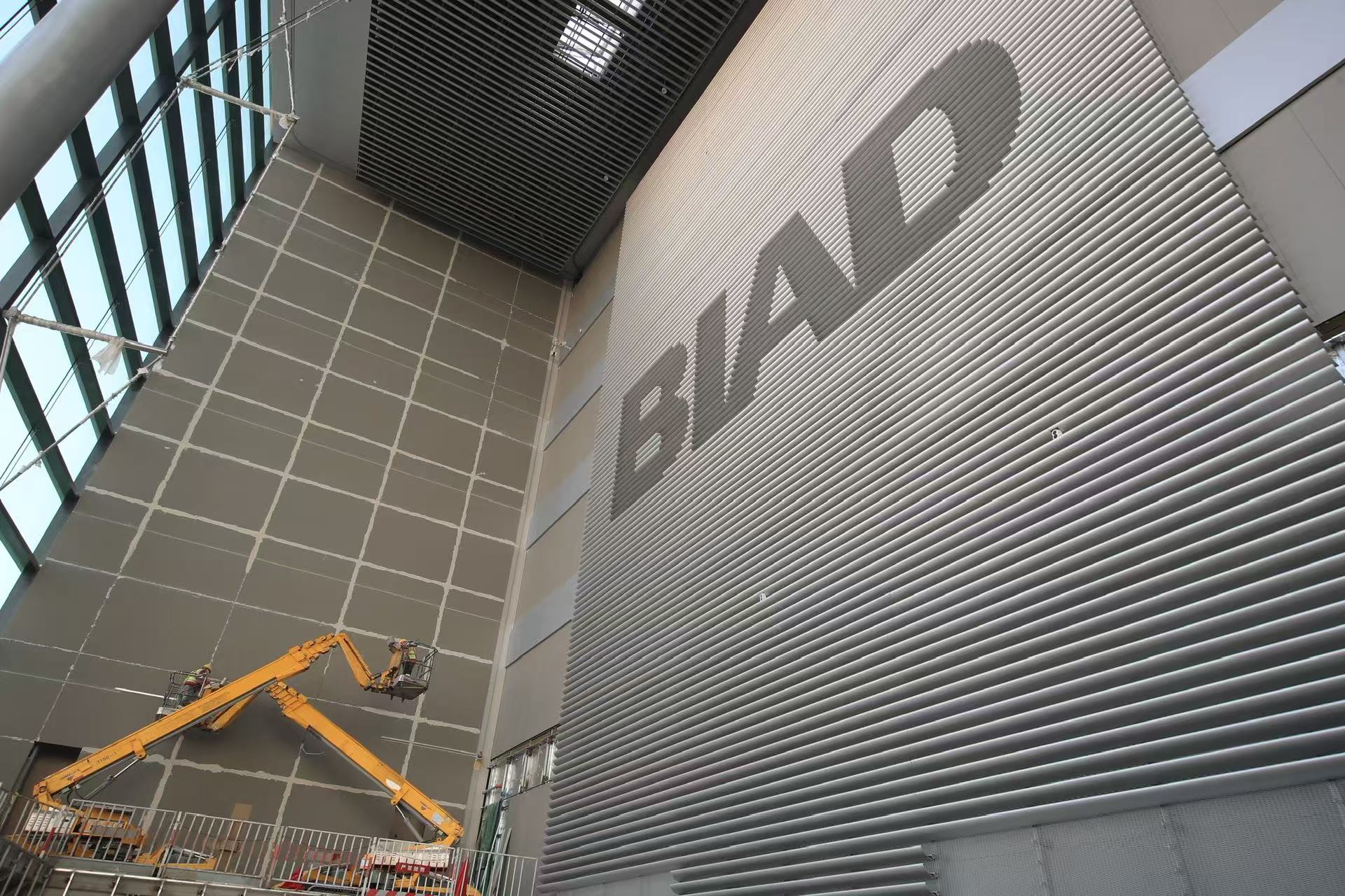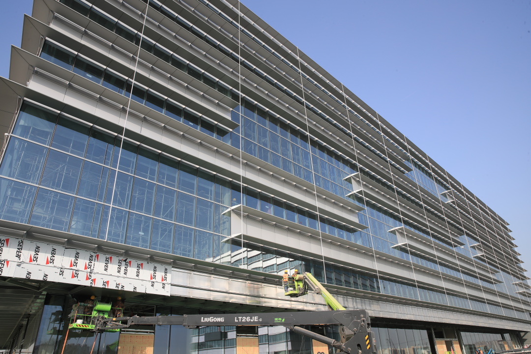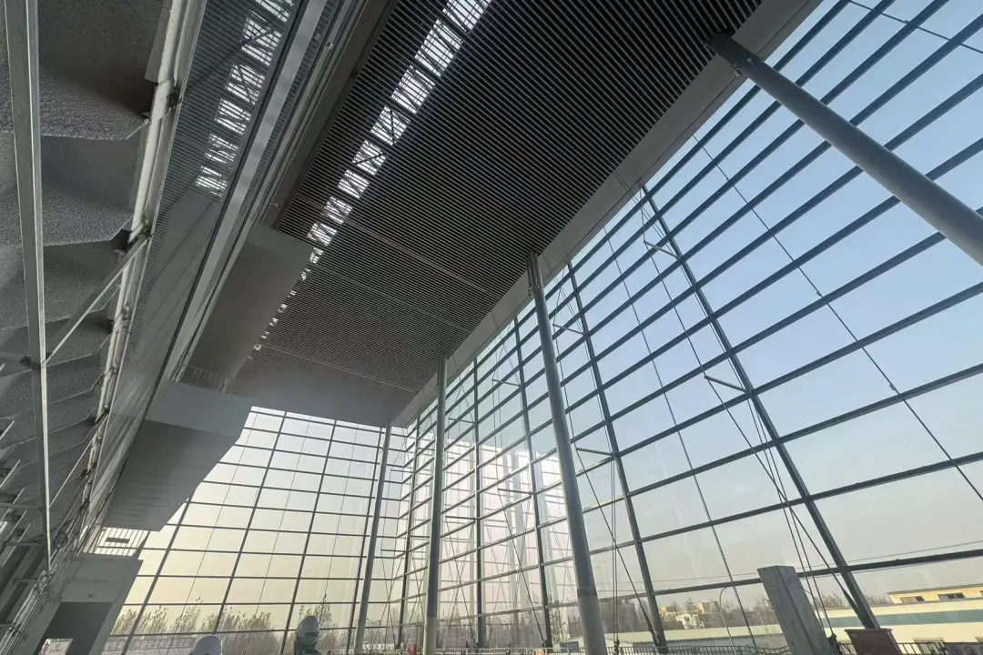 在施工过程中,针对项目部分区域悬挑结构给幕墙安装带来的挑战,技术团队创新采用“先支护后安装”的协同方案,借鉴主体施工阶段球铰支座软性连接的支护经验,为幕墙龙骨搭建了稳定的支撑体系,保障了大跨度构件的安装安全。面对多专业交叉作业的压力,项目团队实施了“分区段、错峰次”的施工计划,精准衔接幕墙安装与机电管线铺设,通过现场智能调度系统减少了工序干扰。同时,所有幕墙构件均采用机器人预制加工,不仅实现了近乎零误差的精度控制,更降低了现场作业能耗与废料产生,契合项目“过程降碳”的示范要求。