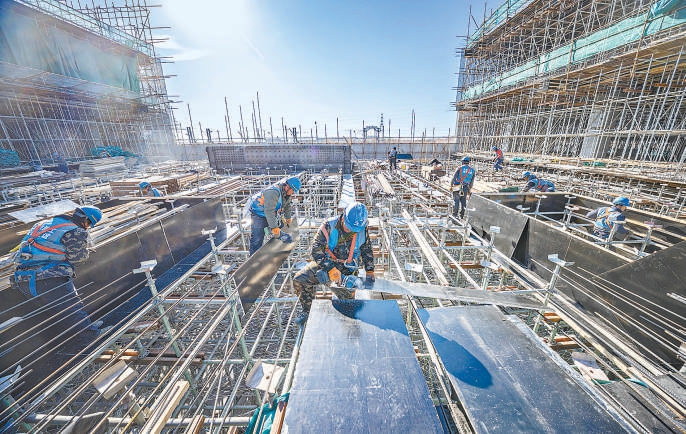爬上临时钢管楼梯,便是主体结构施工的作业面,绑扎钢筋,铺木条、钉模板、拧螺丝……在繁忙的作业面上,45岁的木工窦师傅,干活儿十分麻利。谈到寒冬作业,他抹了把额角:“现在哪儿干活不冷?都一样。”问及想不想家,他顿了顿,笑了笑:“想啊,但活干好了,心里踏实。”