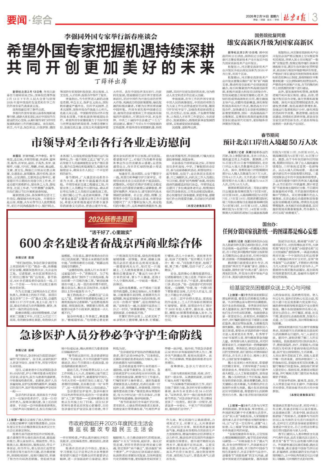 2026-02-24“咱们加把劲,争取在除夕前把地上两层结构干完!”晨会一散,洪锋戴好安全帽,裹紧灰色棉大衣,大步走向工地。他的面前,是整体“跃”出地面的丰台区园博园合生汇项目。春节在岗的他和项目团队,正在冲刺一个新年新目标——今年5月工程主体结构全面封顶。