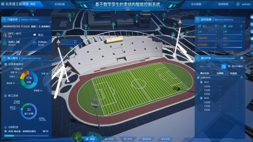该技术创新主要取得了四项成果,即系统地建立了以“误差高效控制-连续动态计算-安全质量管控”为核心的大跨度索网结构施工形态控制理论与方法,解决了索结构形态精准控制难题;针对复杂双层索结构、桅杆支承的柔性边界索网等新型索结构,研发了环索辅助提升方法、动态平衡整体提升方法及配套施工装备,实现了索结构精准成形;提出了基于施工全过程受力性能的索结构工装设计方法,发明了自动放索装置、变角度拉索提升装置等装备,形成系列产品,实现了自动放索、精准索夹安装、高效提升与张拉等功能;开发了基于数字孪生的索结构施工智能控制系统,实现了全要素施工仿真、监控预警、分析决策和自动调控。