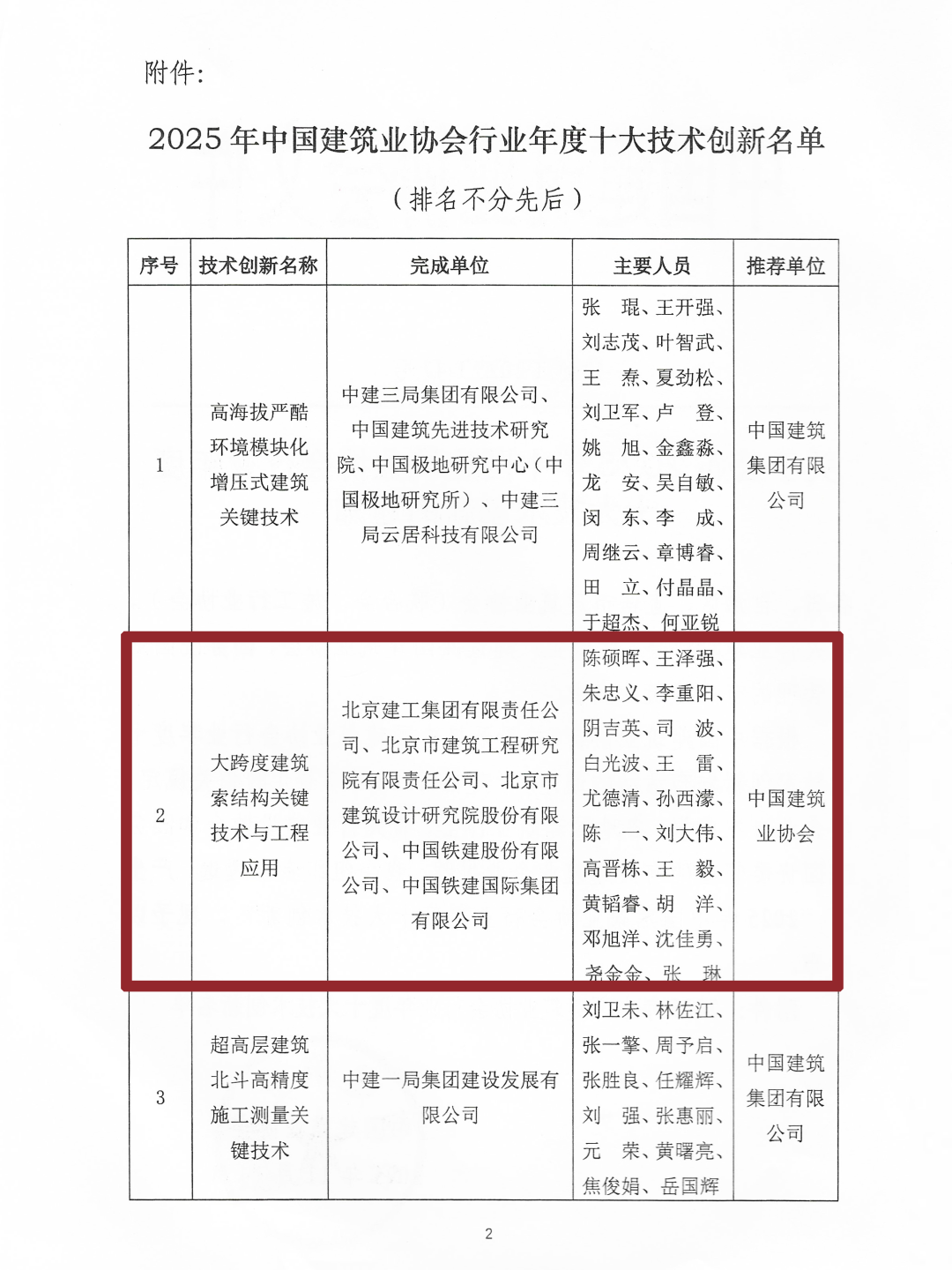2026-01-04近日,中国建筑业协会年度行业技术创新大会在海口召开。会上发布了2025年中国建筑业协会行业年度十大技术创新,北京建工技术创新成果“大跨度建筑索结构关键技术与工程应用”荣登榜单。这是继2024年后,集团技术创新成果再度入选。