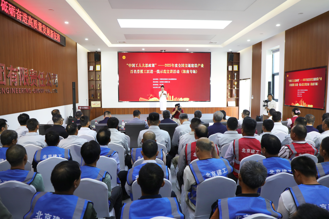 2025-12-09为深入学习贯彻党的二十大和党的二十届四中全会精神,贯彻落实习近平总书记在庆祝中华全国总工会成立100周年暨全国劳动模范和先进工作者表彰大会上的重要讲话精神,12月5日,中国海员建设工会全国委员会在海南省艺术中心(演艺中心)工程施工现场主办了“中国工人大思政课”——2025年度全国交通建设产业百名劳模工匠进一线示范宣讲活动(海南专场)。北京建工集团一线建设者现场聆听了不同行业劳模的先进事迹和感人故事。