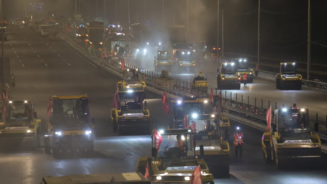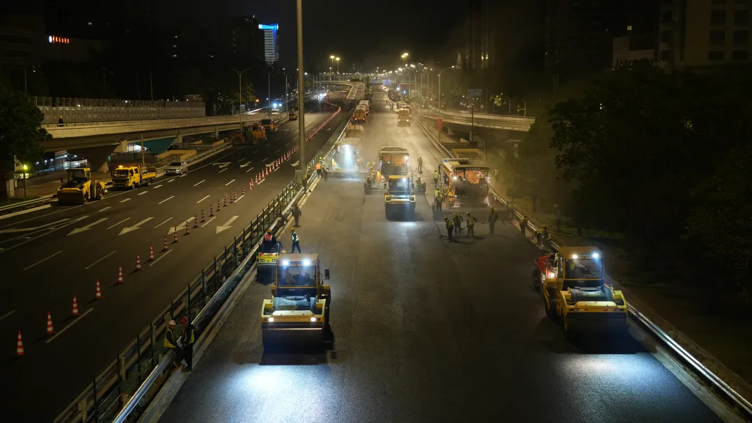 为保障日均车流量巨大的城市主动脉“不停运”,工程选择了最高难度的模式:每日23点至次日5点,在有限的6小时内,多个作业面同步展开,完成旧路铣刨、新料摊铺、精细顺接等全套工序。