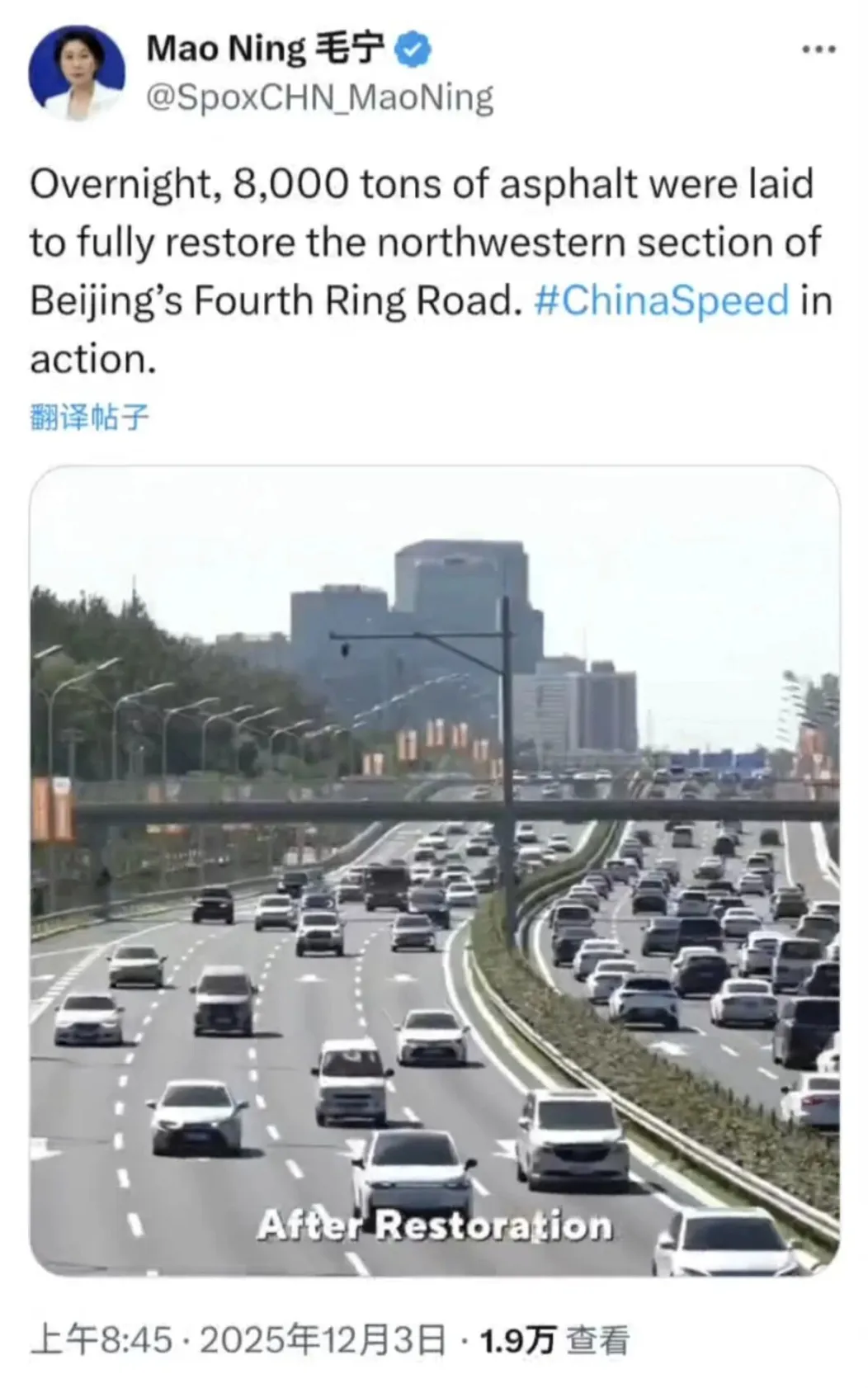 2025-12-08近日,外交部新闻发言人毛宁通过海外社交平台,分享了一段以“中国速度”为主题的视频,向世界展示了北京四环路大修及环境提升工程的卓越成果。这不仅是基础设施的物理更新,更是一次中国在超大城市治理中系统效能、组织协调与技术创新速度的集中展现。