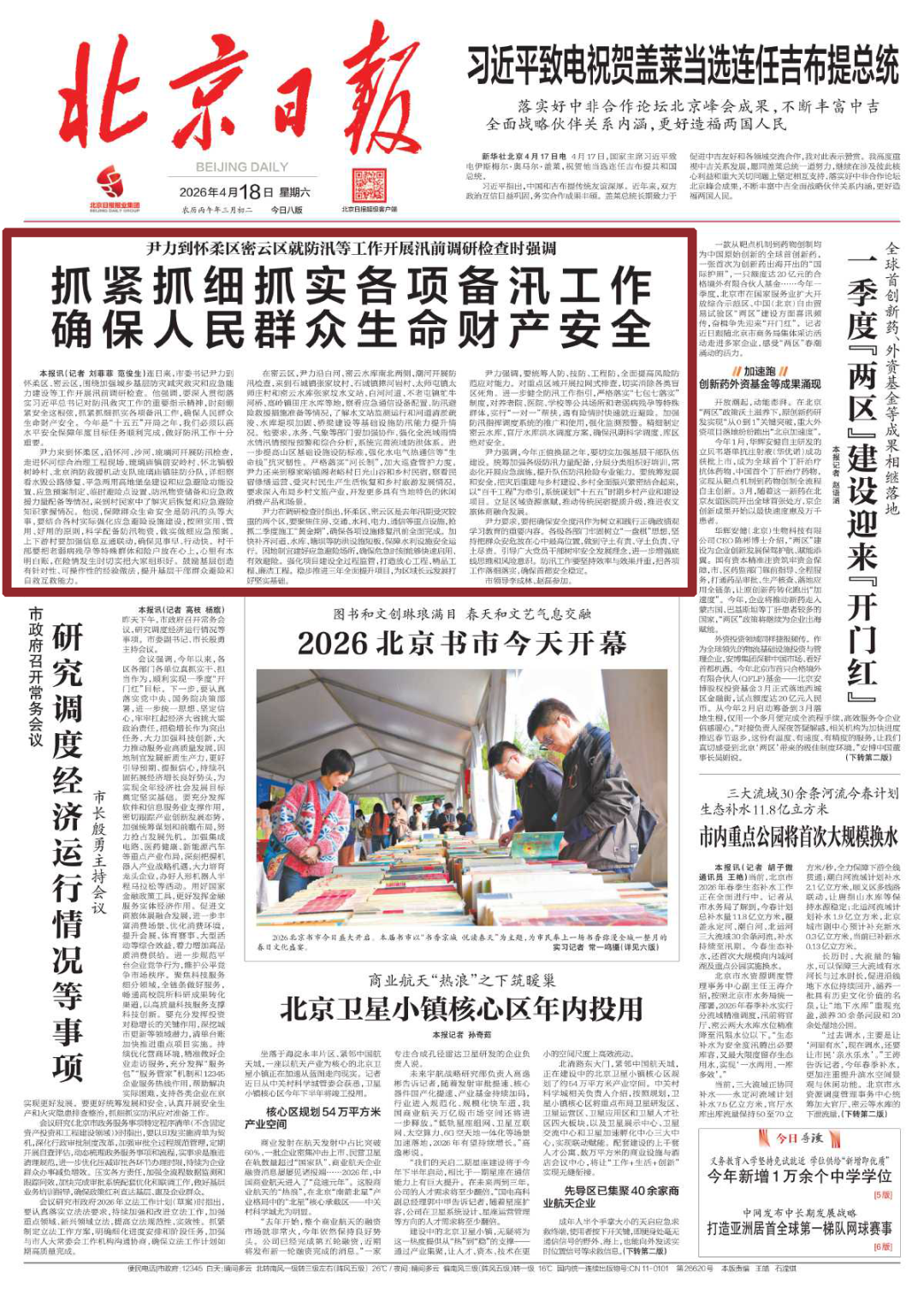 2026-04-20据《北京日报》报道,连日来,市委书记尹力到怀柔区、密云区,围绕加强城乡基层防灾减灾救灾和应急能力建设等工作开展汛前调研检查。他强调,要深入贯彻落实习近平总书记对防汛救灾工作的重要指示精神,时刻绷紧安全这根弦,抓紧抓细抓实各项备汛工作,确保人民群众生命财产安全。今年是“十五五”开局之年,我们必须以高水平安全保障年度目标任务顺利完成,做好防汛工作十分重要。北京建工集团副总经理何海琦参加部分点位活动。